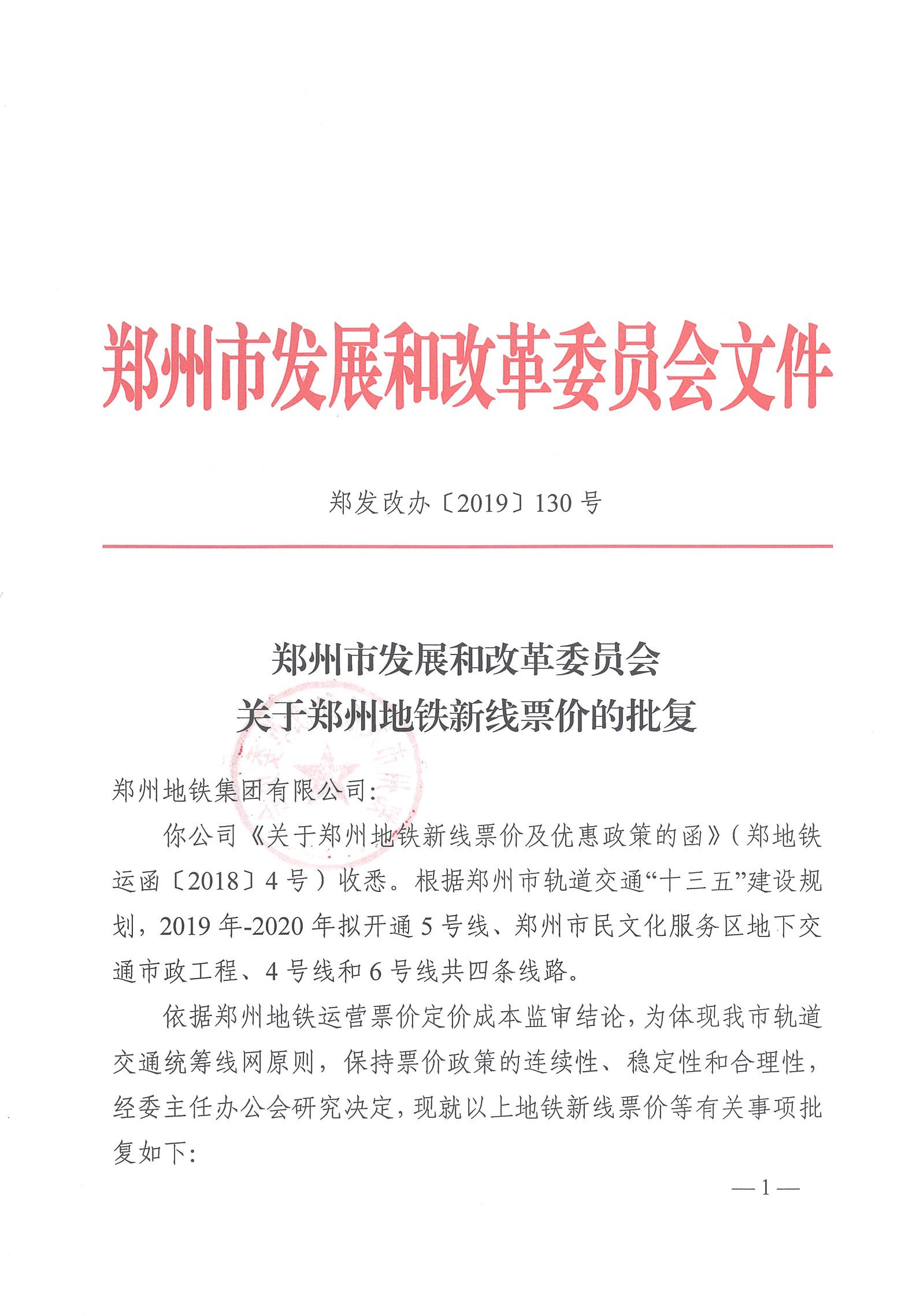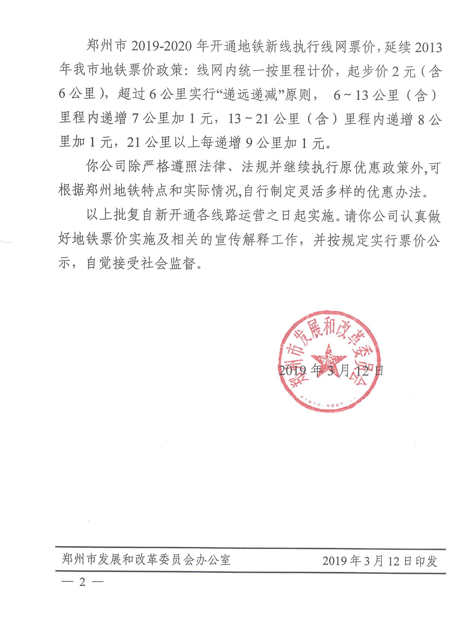 郑州市发展和改革委员会关于郑州地铁新线票价的批复