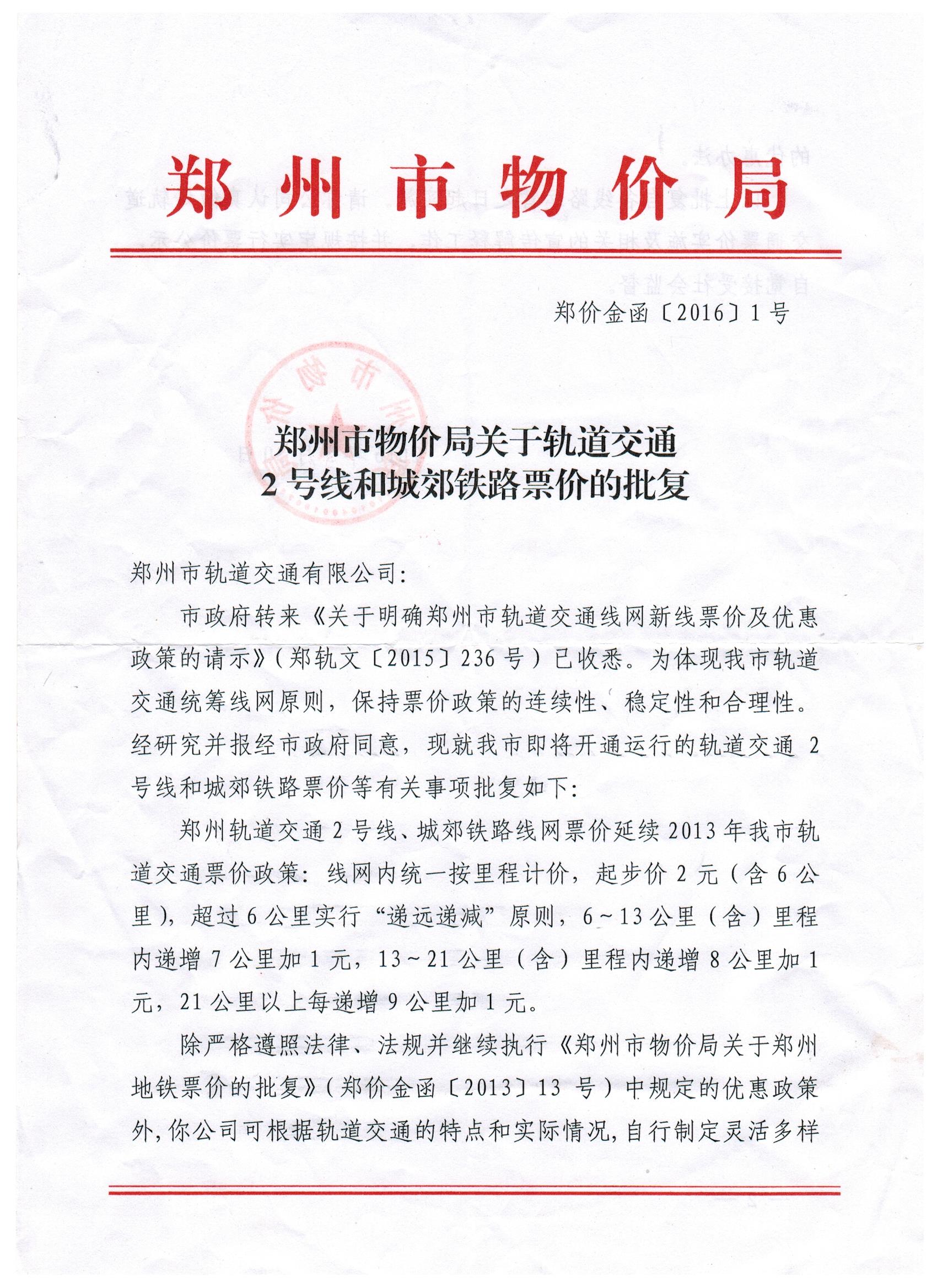 郑州市物价局关于轨道交通2号线和城郊铁路票价的批复